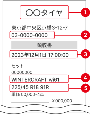 ①店舗名、②店舗電話番号、③購入日、④購入商品名、⑤購入タイヤサイズ、タイヤ購入金額をはっきり確認出来る領収書の画像をご準備ください。