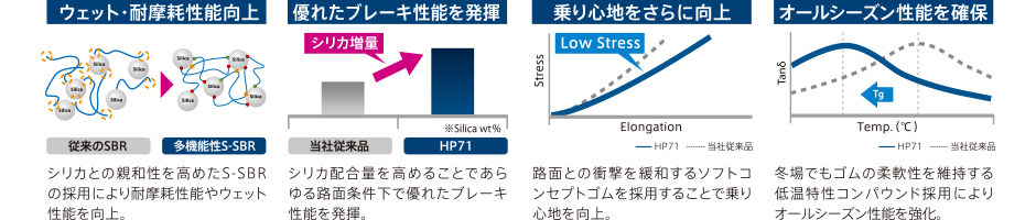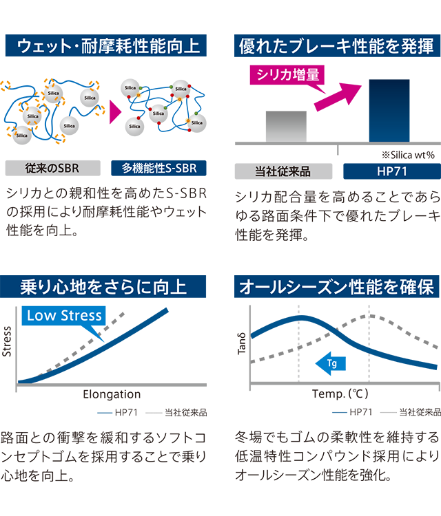 HP71は道路の段差や継ぎ目のショックが少なくなり、全体的にマイルドな感じになりました。また静粛性も一般道路・高速道路共にワンランク上がりました。走行中は音楽を流していることが多いのですが、以前より音量を落としても気持ちよく音楽が聞こえるようになりました。