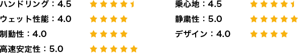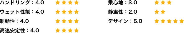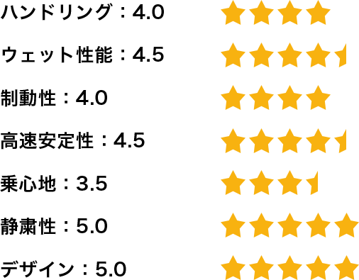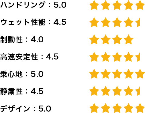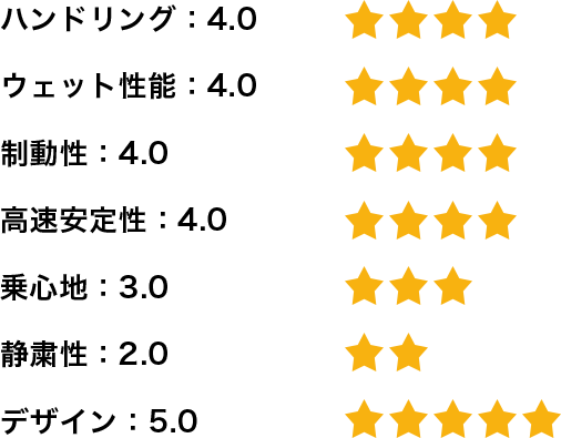 全体のバランスがとても高いタイヤで過去使用してきたタイヤと比べても遜色なく、むしろ上位を争うレベルです。この低価格でこれだけのパフォーマンスを誇っていることは素直にすごいと感じます。毎日のドライブが一段と楽しくなるタイヤです。