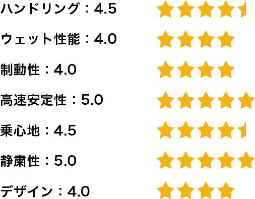 長距離、山間部、晴天、大雨、高速、一般道、色々な環境・状況で運転をしましたが、ドライ性能・ウェット性能共に十分なものであり、今まで使用した国産タイヤと比較しても国産タイヤ以上の乗り心地や静粛性が得られます。低燃費タイヤと比較すると燃費は若干落ちますが、その分カーブでの安定性を感じられるため、燃費が多少増加しても損した気分にはならないと思います。