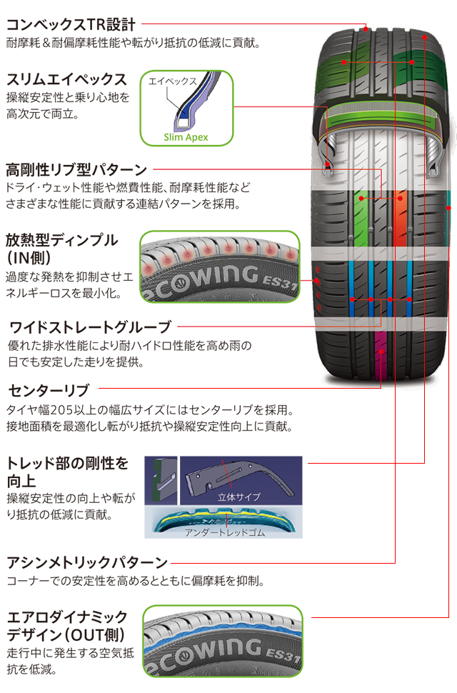 静粛性能では今まで履いた国産タイヤよりとても静かでクッション性能も良く快適性が高くとても満足しています。エコウィングES31はトータルバランスがとれたコストパフォーマンスが高くおすすめが出来るタイヤだと思いました。