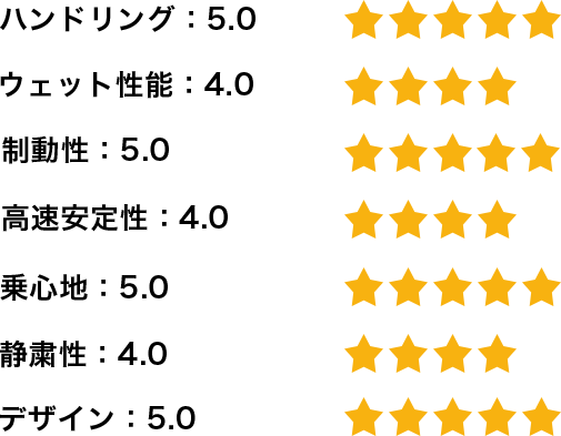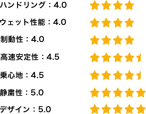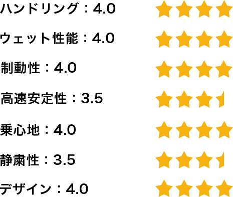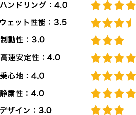 かなり雨が降っていた状態で高速道路を300kmほど走行しましたが、ハイドロプレーニング現象が起こるようなこともなく、不安になることはありませんでした。山坂道も走行しましたが、タイヤのスキール音が鳴ったり、スリップするようなこともなく、雨の高速道路と同様に不安になることはありませんでした。