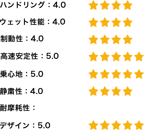 まず、一般道での評価は、静粛性・乗り心地ともにとてもよく交換当初と変化はないです。路面のギャップの吸収、雨天時、好天時ともに制動性も何の問題もありません。気持よく運転ができます。