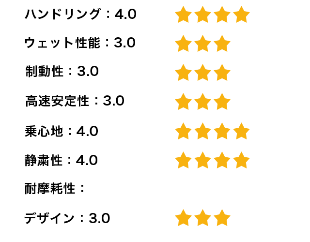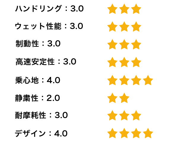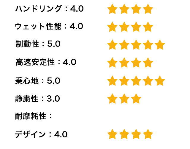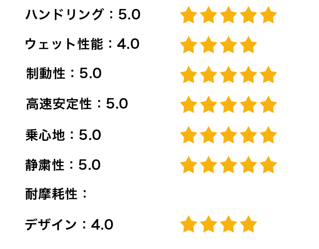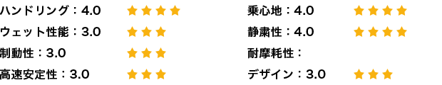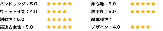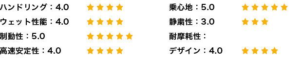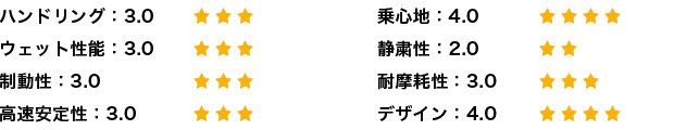 全体的に満足度は高いがウエット性能はしっかり確認できていないため、次回の評価で詳しく書いてみたいと思う。