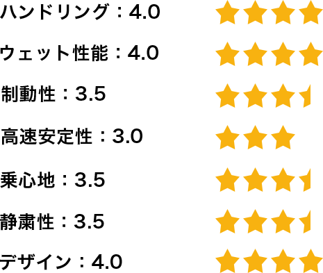 かなり雨が降っていた状態で高速道路を300kmほど走行しましたが、ハイドロプレーニング現象が起こるようなこともなく、不安になることはありませんでした。山坂道も走行しましたが、タイヤのスキール音が鳴ったり、スリップするようなこともなく、雨の高速道路と同様に不安になることはありませんでした。