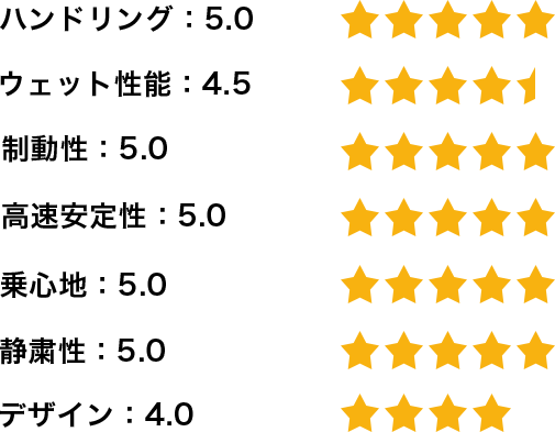 全く問題ない。高速域でも特に不安に感じる事はなく、ちょっとした峠道のカーブでもしっかり踏ん張りサイドウォールの剛性を感じられドライブを楽しませてくれる。