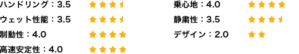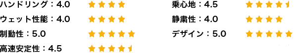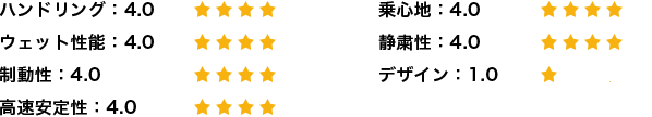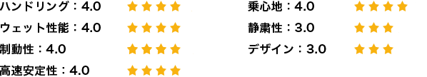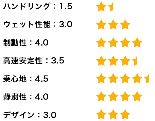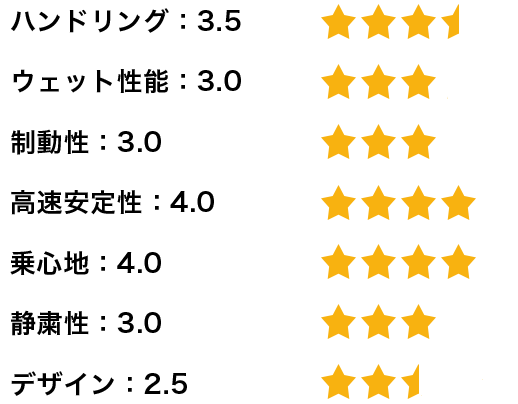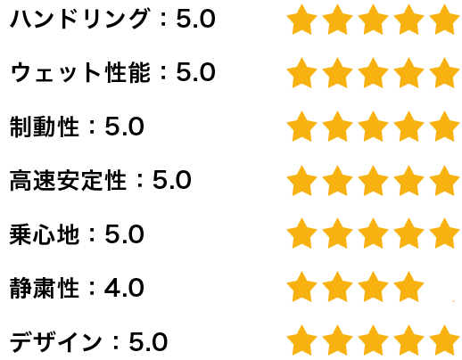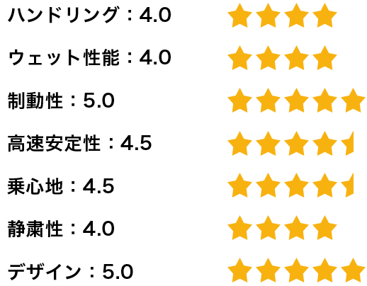 一方で、コーナーを高いスピードで走行しても、タイヤがたわまず、安定感があり、グリップ感も良好なので、ハンドリング性能は優れていると思います。濡れた路面でのハンドリング性能や制動性にも問題はありません。