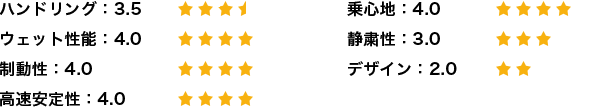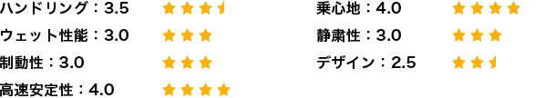3ヶ月使用しての感想としては、直線走行時でのブレーキング、コーナリングでのブレーキングともに不安を感じることはありませんでした。高速走行時では、浮き上がる感じもなくフワフワ感もなく不安感はありませんでした。また、コーナー時のハンドリングが安定されていると思います。雨天時の高速走行でも滑るような不安もありませんでした。総合的な判定は満足のいくものですが、唯一見た目が細く見えて豪華さを感じません。タイヤのショルダー部の丸みがあるために細く見えてしまします。もう少し角張ったデザインであればいいと思います。