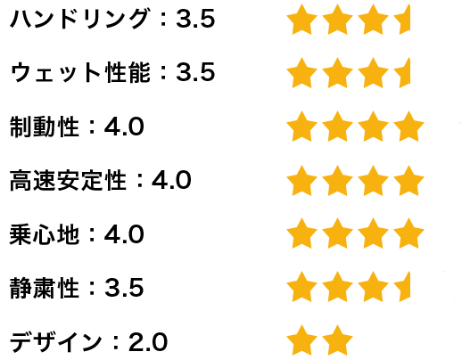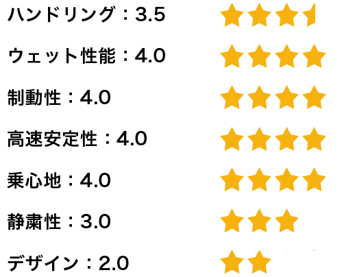 また、コーナー時のハンドリングが安定されていると思います。ハンドルを切った通りに曲がります。更に雨天時の高速走行には不安がなく、タイヤが浮くような感覚もありませんでした。