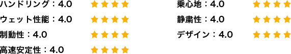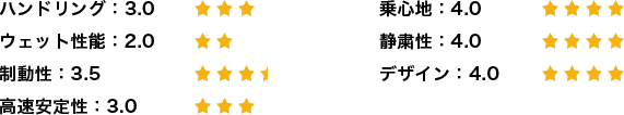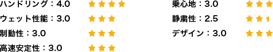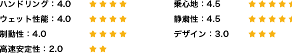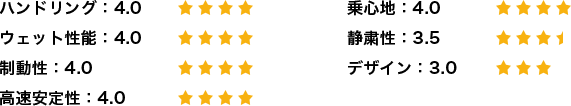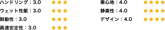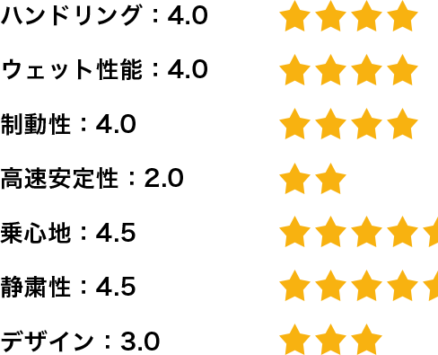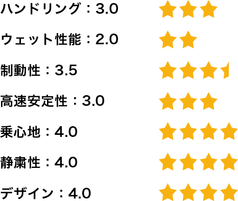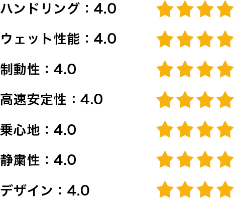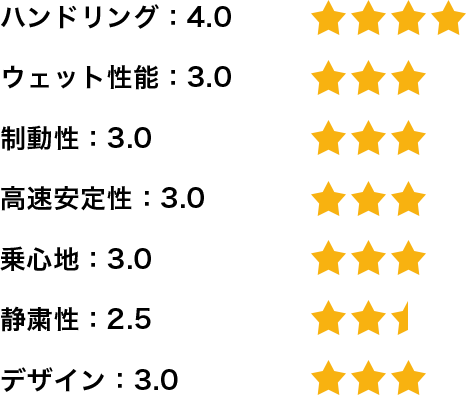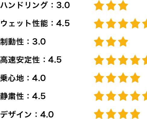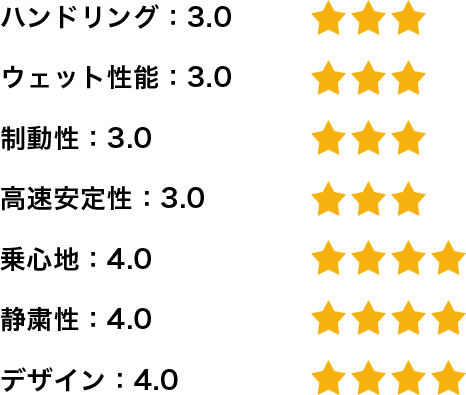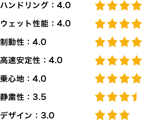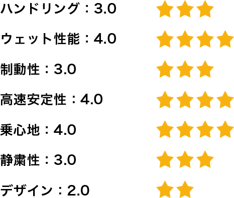 タイヤが比較的柔らかい為、オーバーステアかなと感じることがありました。高速道路も雨の日は安心して走れますが、晴れの日は若干ふわふわしたような感じがしました。これは、空気圧の調整で解決出来ると思います。