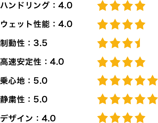 ほぼ毎日通勤で使うのですがとても安定感があり、コーナーでのふわつきもなく、しっかり曲がり、しっかり止まります。高速道路の走行も何度かしましたが静粛性も前回装着タイヤよりも静かに感じることができ車内での会話も全く問題ありませんしハンドリングも良く安心して走行できました。