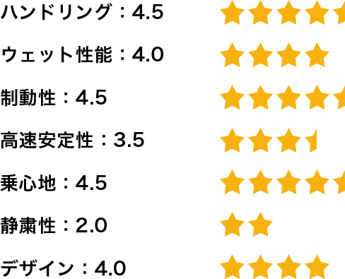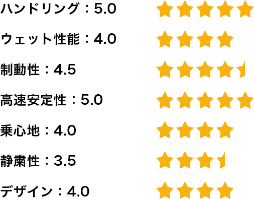 長距離、高速走行時は安定性、ハンドリングにとても優れているのを改めて実感しました。高速時からでもしっかりと止まり、雨の日の走行も安心感があり高速道路での走行も不安は全くなく満足です。