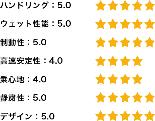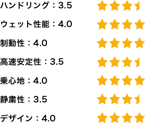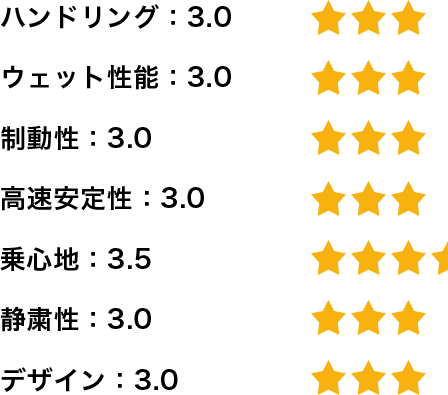 雨の日の運転が多かったが流石の安定性を感じた。水はけも良く濡れた路面でのグリップ力も良いのだと改めて感じ安心して運転ができた。往復約600Kmの日帰り走行をした。市街地・高速道・ワインディングロードの全てを走行、その中でも今回は高速道が約6割の走行。高速走行時もハンドルのブレもなく制動性、静粛性も特に問題なく安定した走行性能を感じた。ワインディングロードもコーナーでのふくらみもふらつきもなくオーバースピードでない限りは特に問題もなく安定した走りができました。点数的には3の普通が多いですが、私自身このタイヤの性能としては満足するものでありました。このタイヤに関してはM+Sなのでこれからのwinterシーズンにどれほどの性能が期待できるのかが楽しみの一つです。それ程雪の降る地域ではないのでスタッドレスまでは必要ない町ですが過信運転をせず安全速度を守って今後の運転を楽しもうと思います。