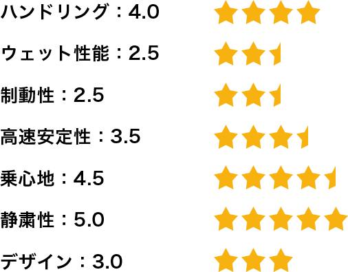 免許取得し25年以上国産タイヤの経験しか無い私はこのタイヤを履いて素晴らしいと感じました。コンフォート系タイヤの部類だと思うので点数はセレナとの相性という意味での評価となります。