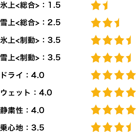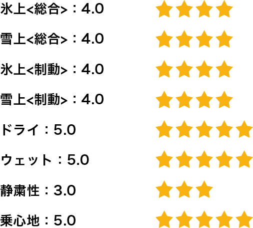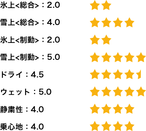 国内メーカーのタイヤでアイスバーンでは良いが雪道ではイマイチという経験をしていたので、この結果には驚きました。新潟は雪の種類も多くスタッドレスタイヤ選びに難儀しますが、このタイヤでは非常に満足な結果を得ることができました。