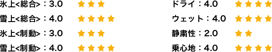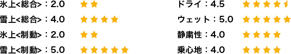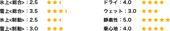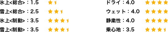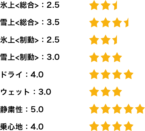 基本的な性能、雪上での曲がる、止まる、発進。氷上での止まる、発進。これに関しては私が別の車に履いている国産メーカーのタイヤと全く遜色なかったです。確かに氷上の発進と、圧雪路面では、国産某スタッドレスのほうが一歩上ですが、普段、安全運転を心がけて運転している限りは、何の問題もないように感じています。今年は例年よりも雪が少ないのですが、おかげでドライ路面での素晴らしい静粛性と乗り心地に気づくことができました。本当にクムホタイヤを履くことが出来てよかったです。最高の機会をありがとうございます。氷上を3としたのは、発進時の空転が気になることでしょうか。しかし走り出してしまえば抜群の安定性でした。