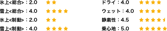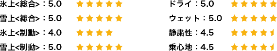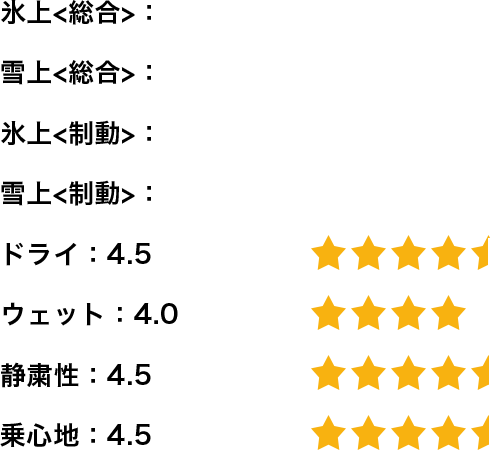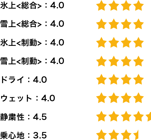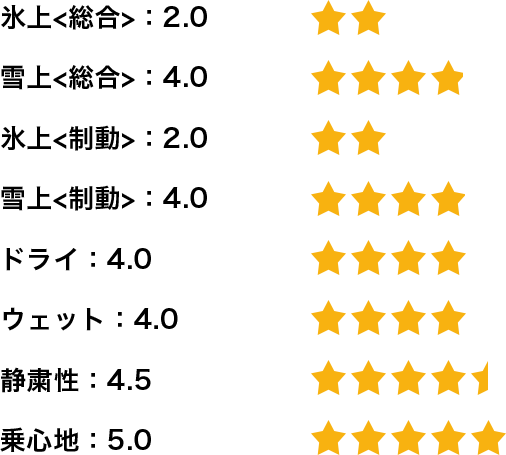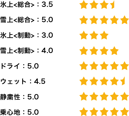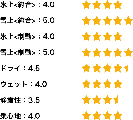 総合的には国産スタッドレスタイヤと遜色はなく同等またはそれ以上に感じます。タイヤのバランスも良く、氷上、雪上、ドライ路面、いずれかのシーンに突出しているスタッドレスタイヤが多い中、総合的にバランスのよいスタッドレスタイヤだと思います。