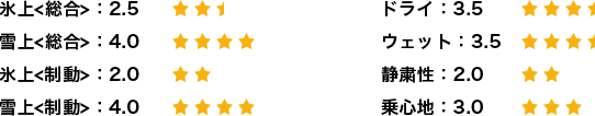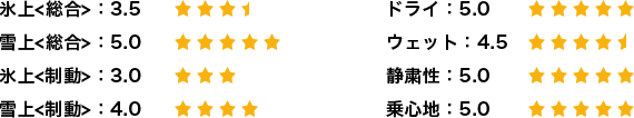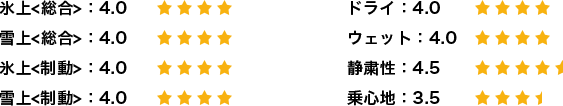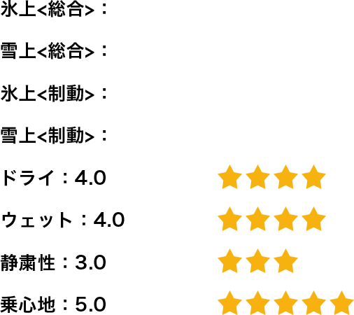 氷上/雪上になってからは氷上でのグリップの低さが非常に際立った印象で、以前使用していたタイヤよりも気を使って操舵しなくてはならなかった。