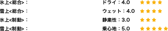 期間は少ないものの雪上性能ですが、タイヤが新しいので当然かもしれませんが効きは良いです。総合的にも制動面でも満足できます。ただ以前履いていたタイヤとの比較は、年数も経っているのでできないのが残念です。